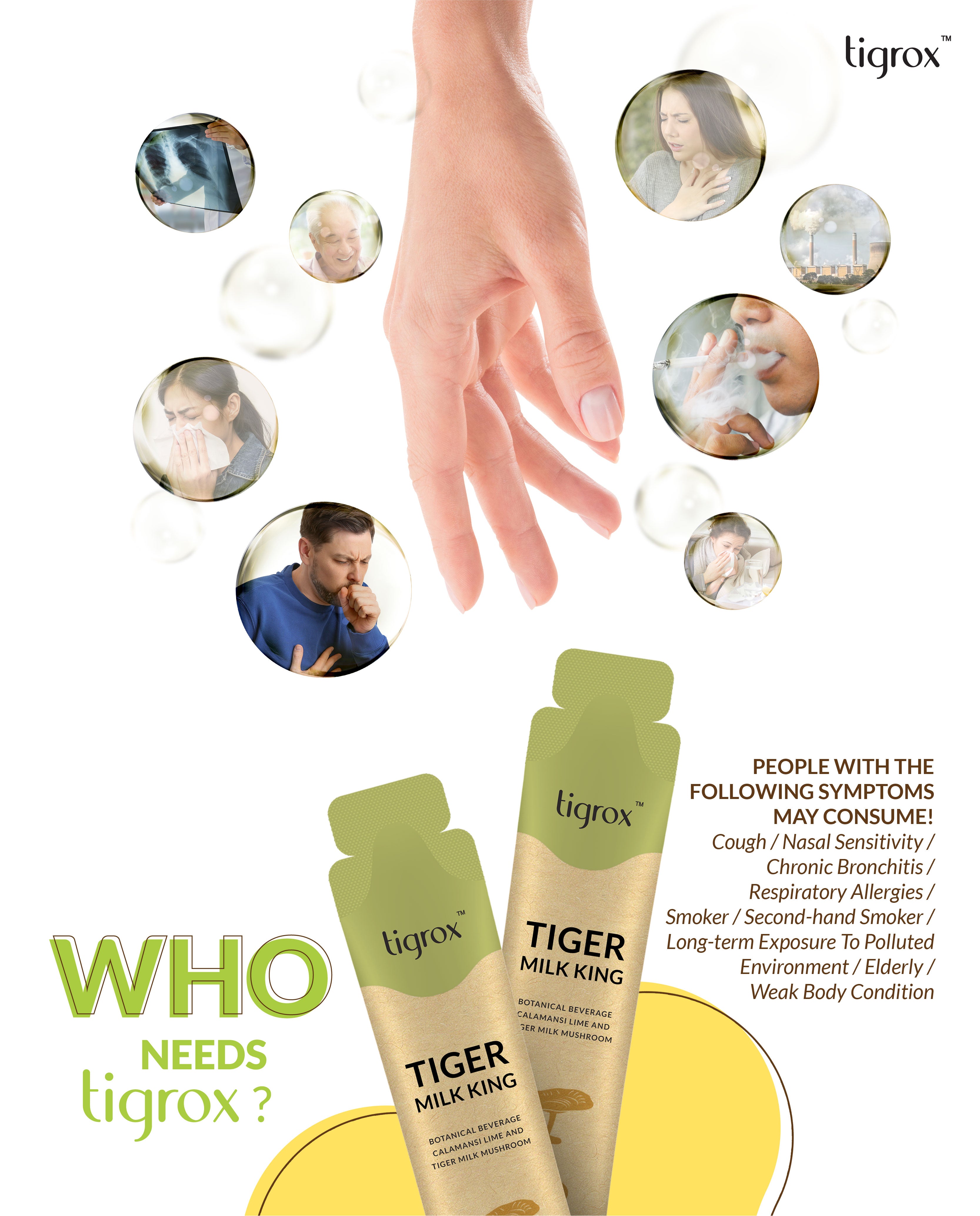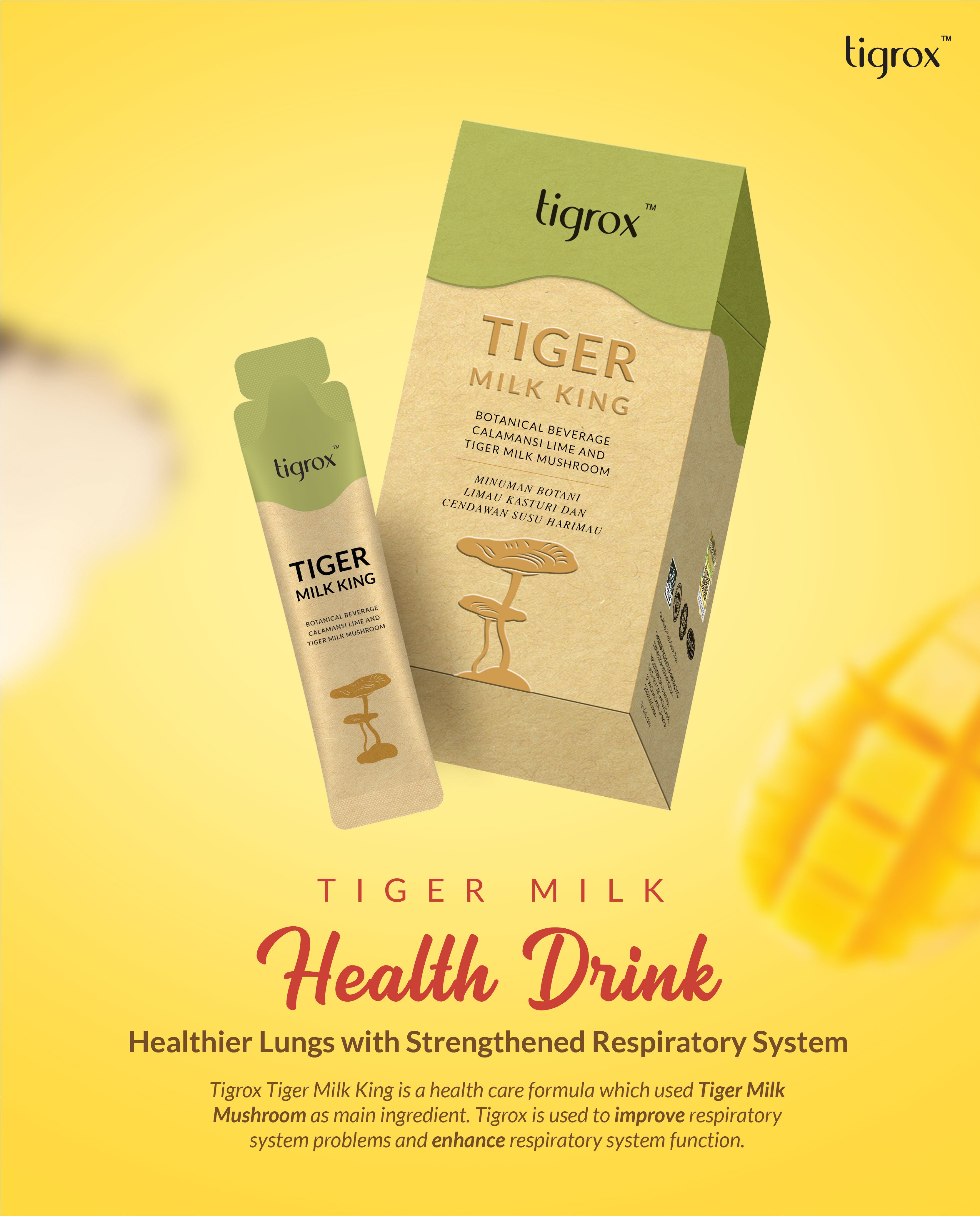 Tiger Milk King is a premium lung health supplement made with Tiger Milk Mushroom, a centuries-old traditional remedy in Malaysia. It is specially formulated to support the respiratory system by reducing inflammation, easing allergies such as asthma and cough, and strengthening immunity against bacteria and environmental pollutants. With scientifically studied active compounds, Tiger Milk King helps improve breathing comfort, protects lung function, and promotes long-term respiratory wellness.