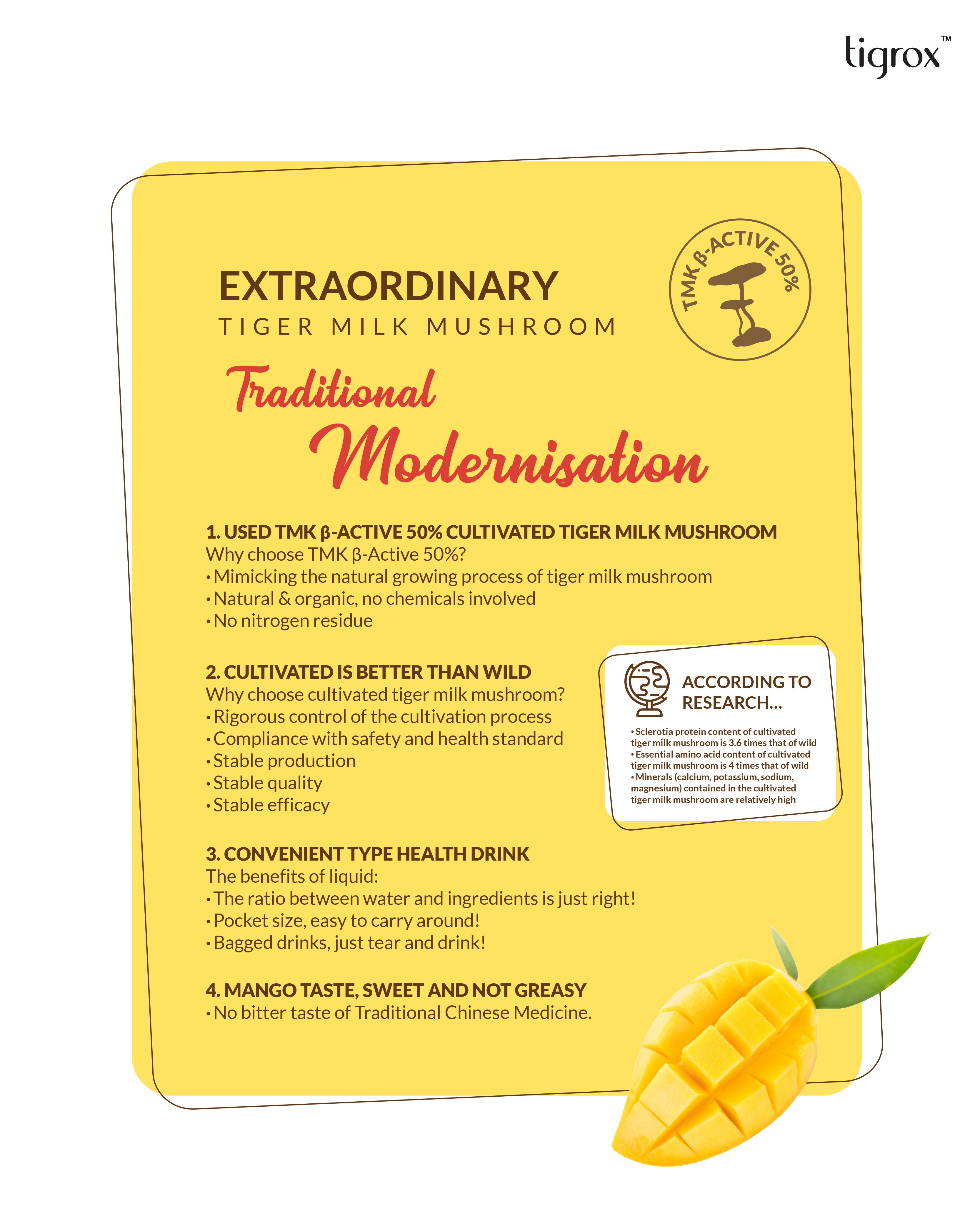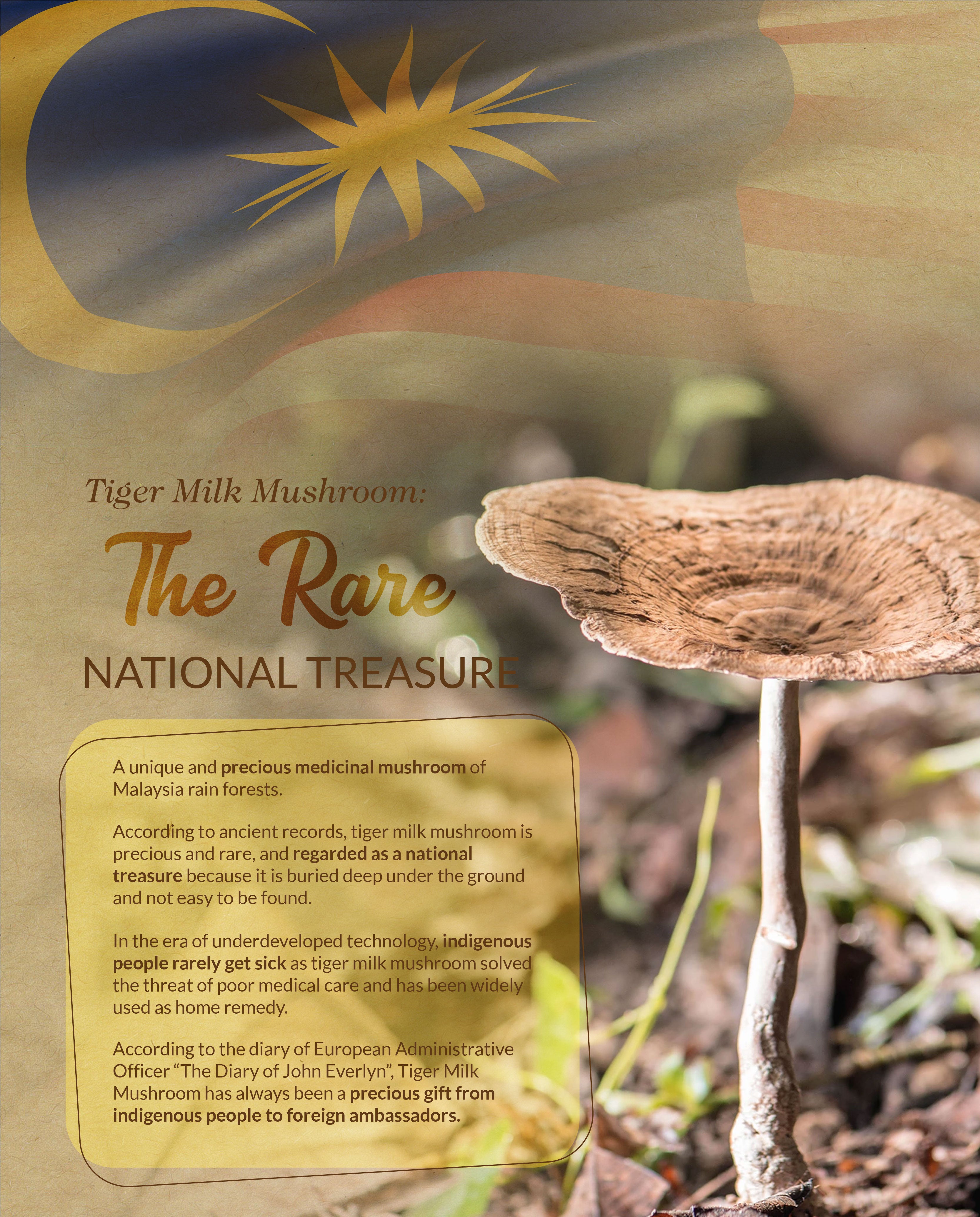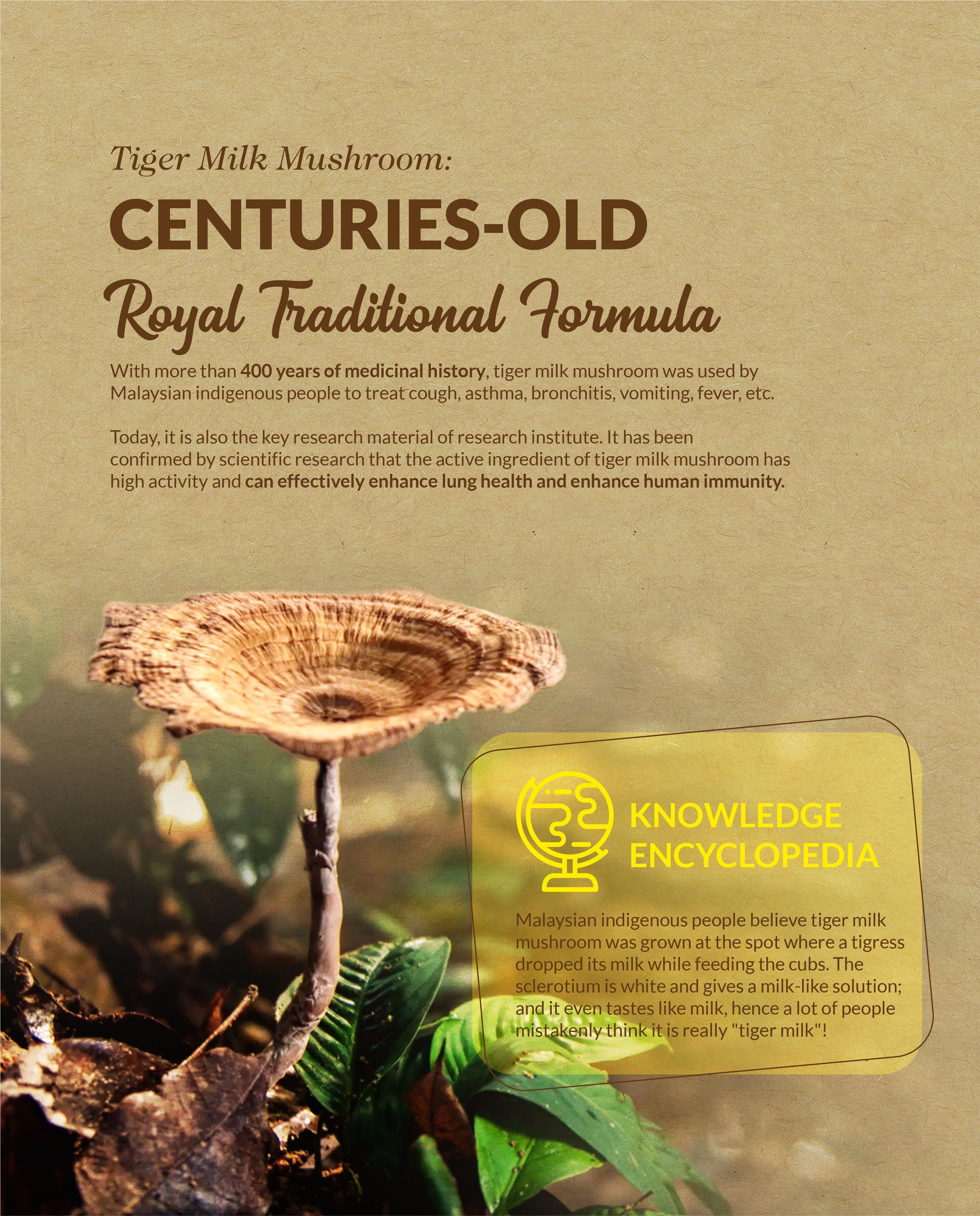 With over 400 years of medicinal history, Tiger Milk Mushroom (Lignosus rhinocerus) has been traditionally used by Malaysian indigenous communities to relieve cough, asthma, bronchitis, fever, vomiting, and fatigue. Today, it has gained global recognition as a key herbal research material, backed by modern scientific studies.