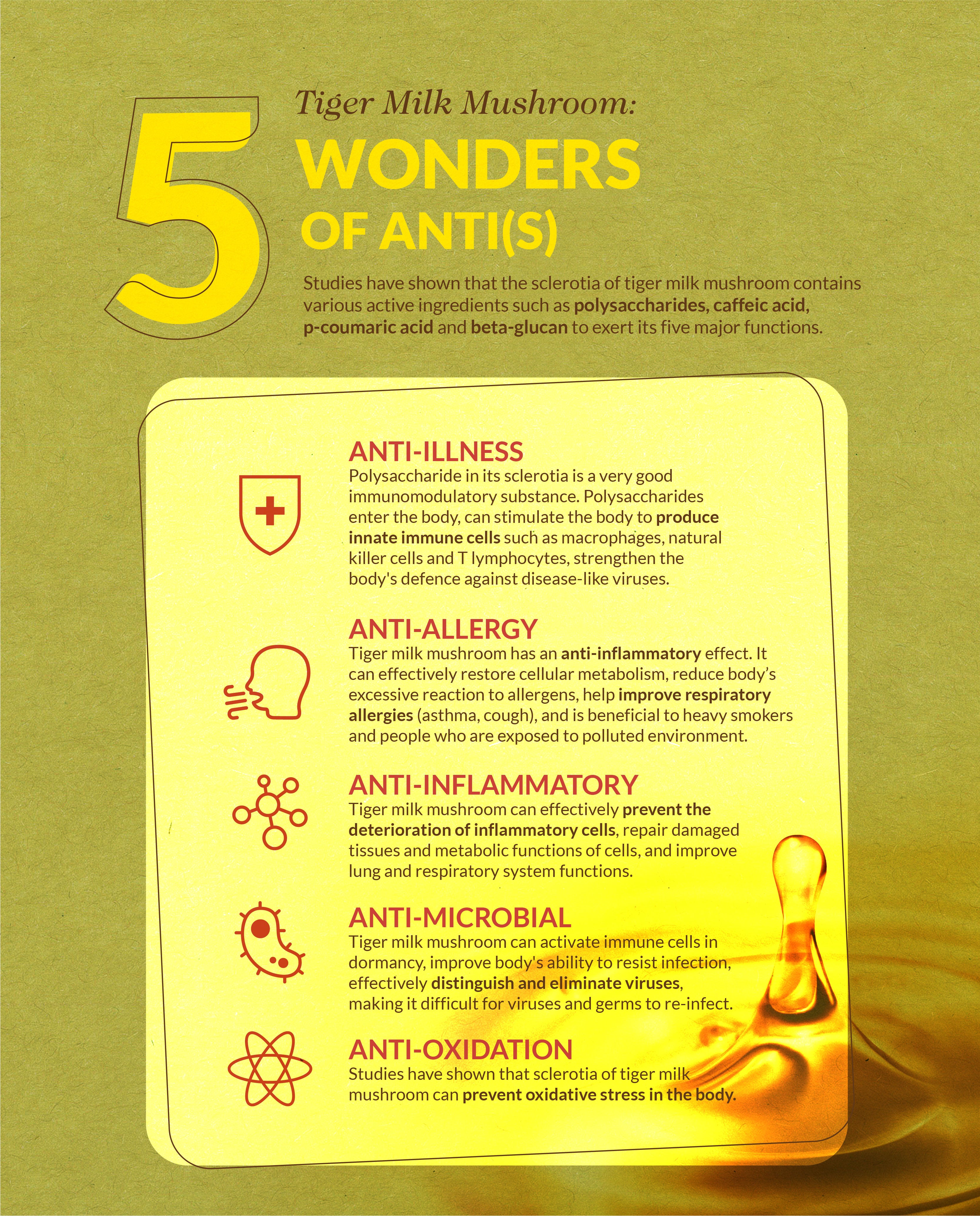 Scientific studies have shown that the sclerotia of tiger milk mushroom contains a rich combination of active compounds such as polysaccharides, caffeic acid, p-coumaric acid, and beta-glucan. These natural ingredients work together to deliver five major health benefits